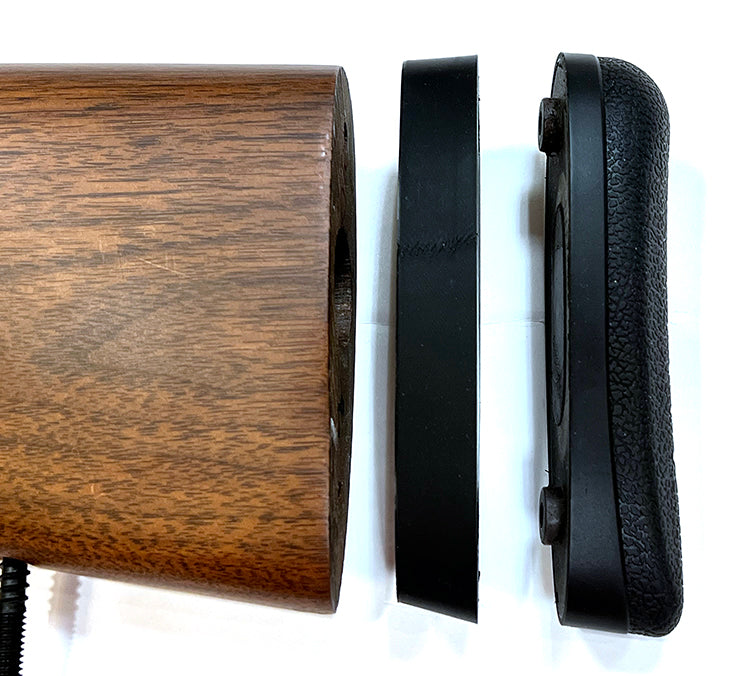 This kit allows V1 stock owners to use the V2 non-adjustable rubber buttpad that comes stock on the new V2 base model systems. The kit includes a spacer that tapers the rear of the V1 stock up slightly to match the V2 pad dimensions without noticeable overhang and the need to drill indents into the wood to fit the V2 style alignment nubs. It uses the existing V1 upper screw hole into the stock, but a new screw hole needs to be made slightly below the existing lower screw hole to mount this pad.
