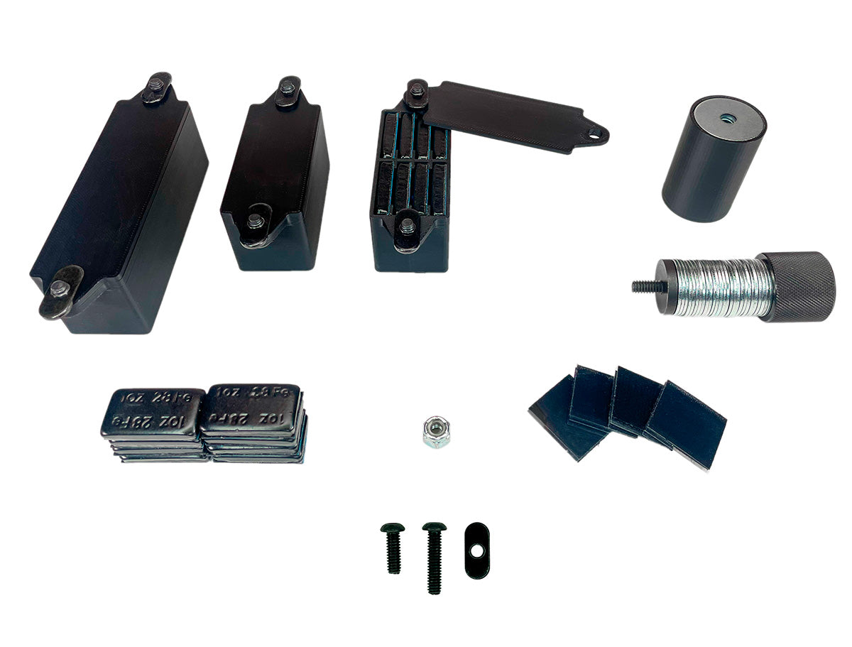 The kit includes a front weight kit with 1/4x20 thread pitch knob and weight locking bolts that helps simulate barrel weight. The rear weight kit includes two 2 slot weight boxes and one 3 slot weight box that hold the included weights securely. The rear weights are designed to be added to the rear bar and center riser arm, but can be attached anywhere on the Real Stock Pro to balance the weight to match your real world clay gun. We re-designed the Real Stock Pro V2.5 forearm with a weight platform on the front of the forearm where the barrel is typically but when using with a Quest 3, which only requires the rear controller, you can add a weight box on top of the forearm as well if needed. Additional weights can be added in the pocket of the forearm above the wrench holder and on the connecting bar which allows you to add weight where weight is needed to keep a perfect balance to your stock.